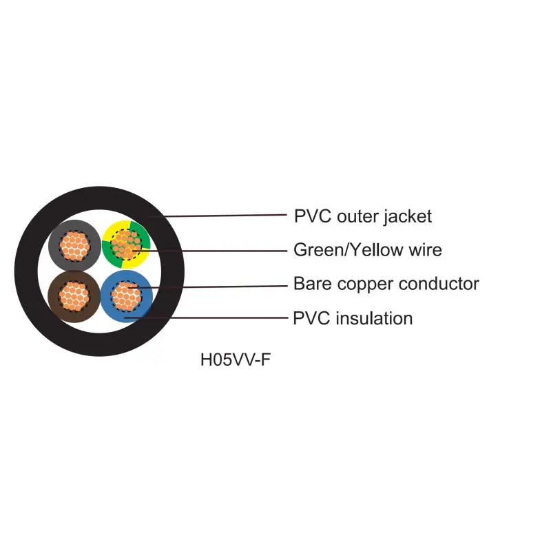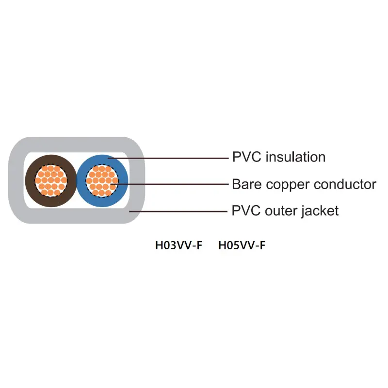 H05VV-F, H05VVH2-F, H03VV-F, H03VVH2-F е составен од фини бакарни спроводници од класа 5, изолација од PVC без олово и обвивка.